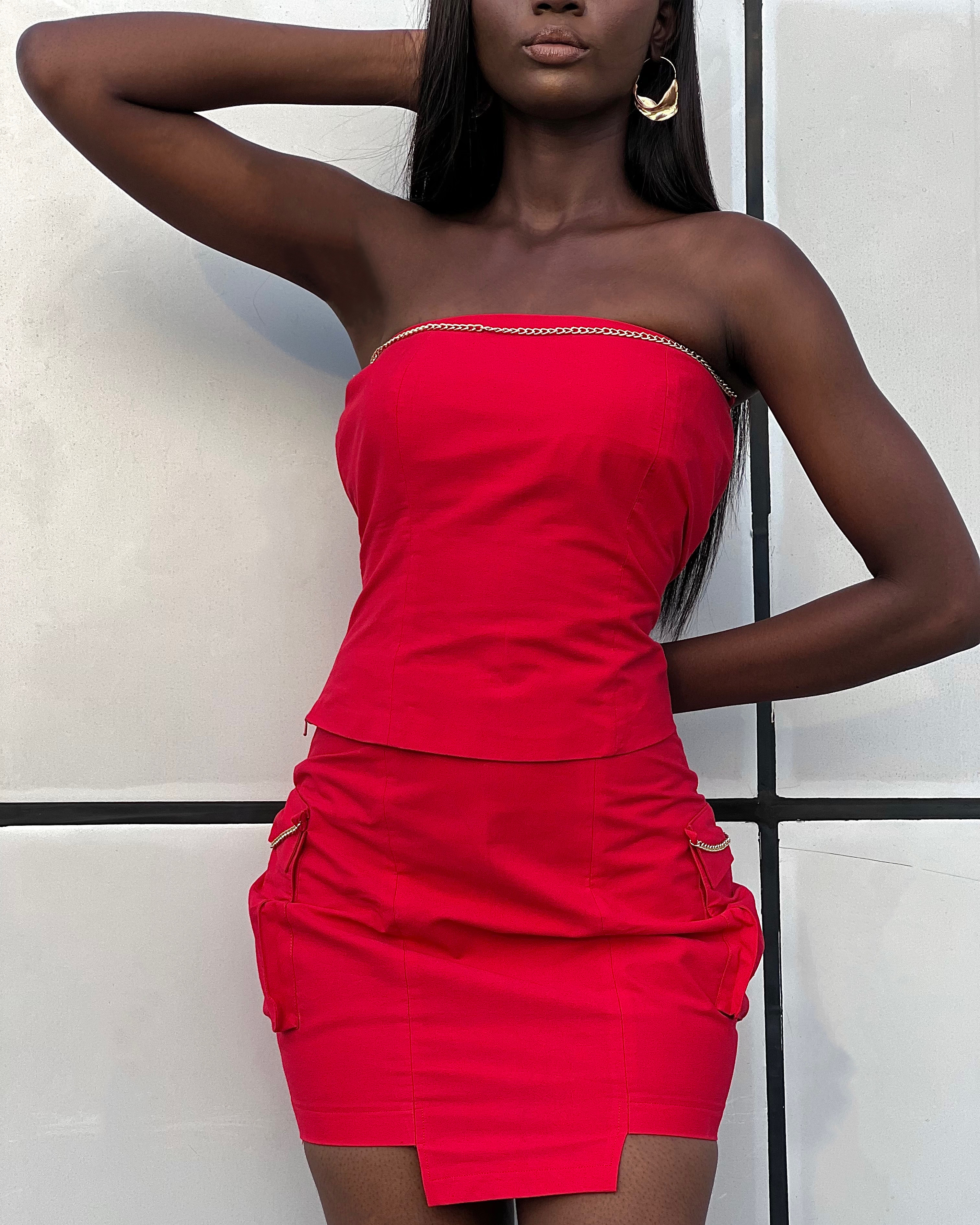 A Combat Two-piece set featuring a strapless top and a short combat skirt with asymmetrical hem. Designed with a chain link detailing