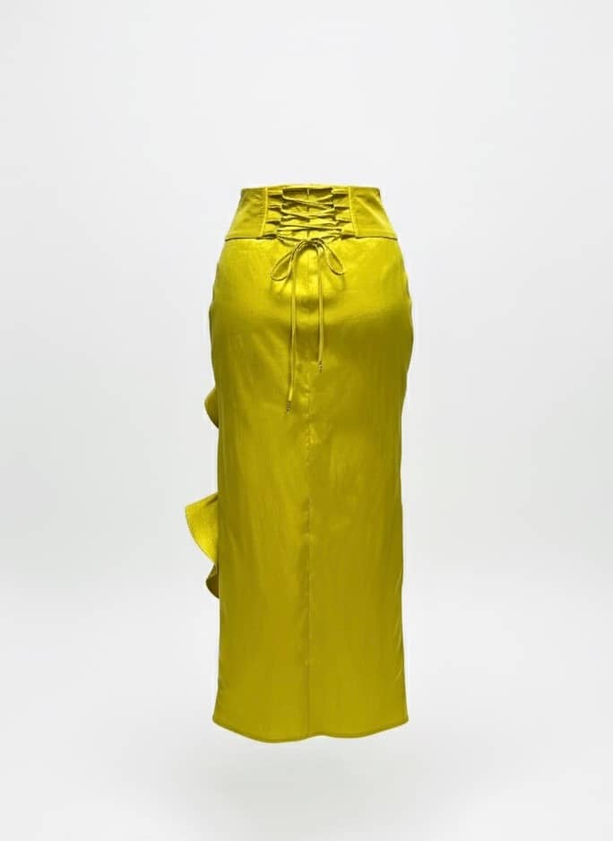 A Maxi High-waisted skirt. Featuring a V-corset in front, dramatic cascading front side ruffles, a corset-style lace-up back detail, in an overall fitted silhouette