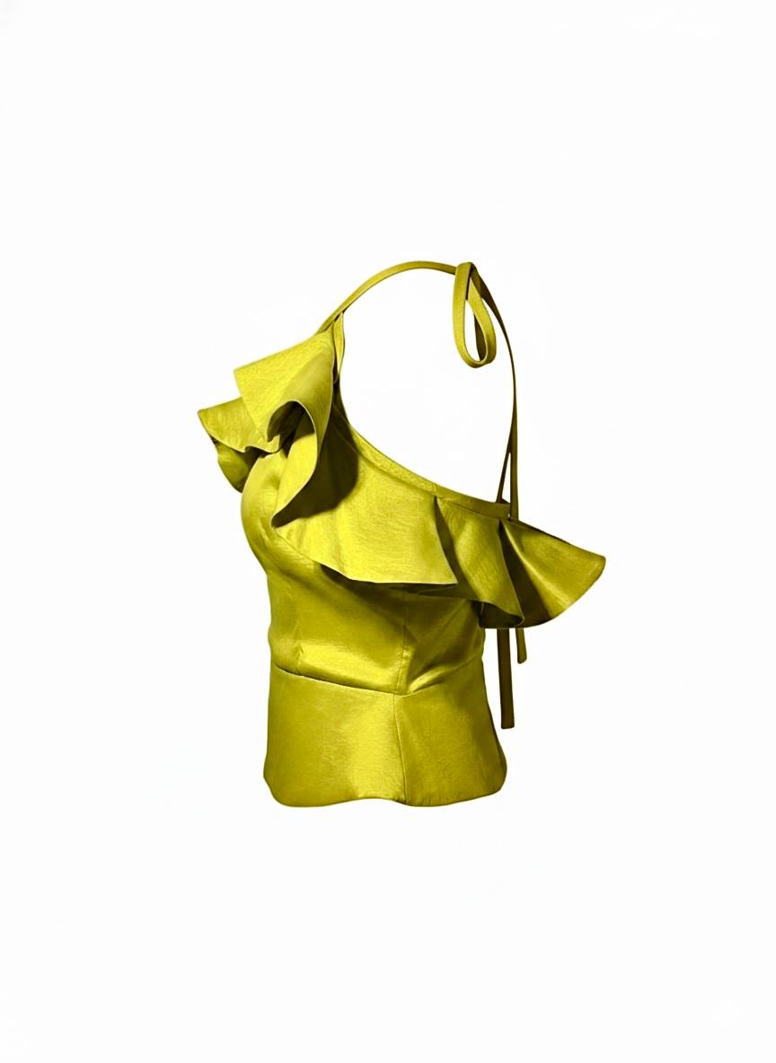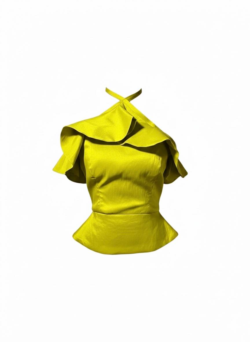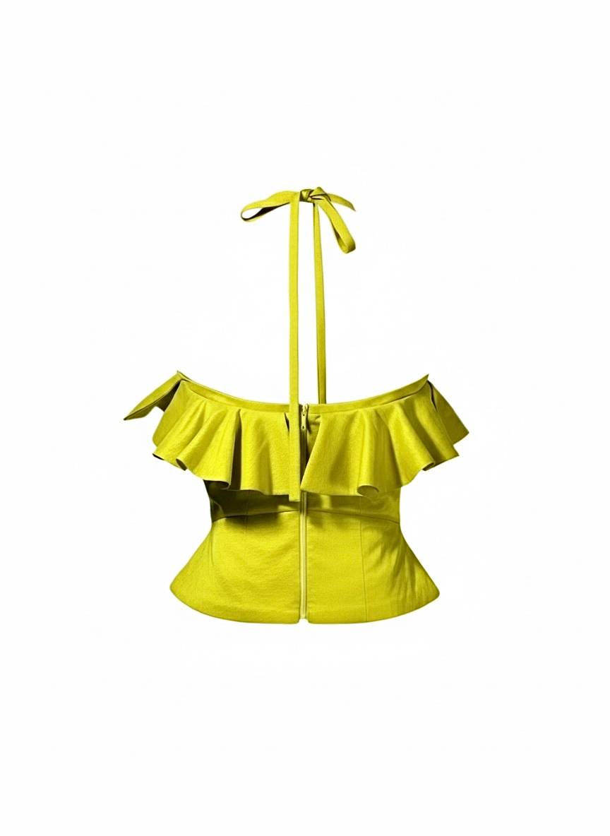 A cross halter ruffle neckline top. Featuring a fitted bodice and a back zipper.