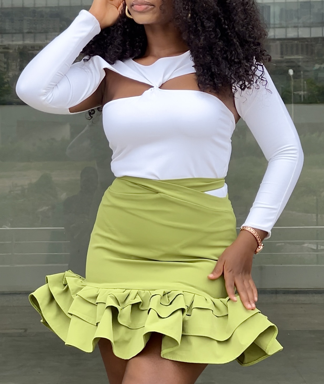 A twist front, cut-out body suit with long sleeves