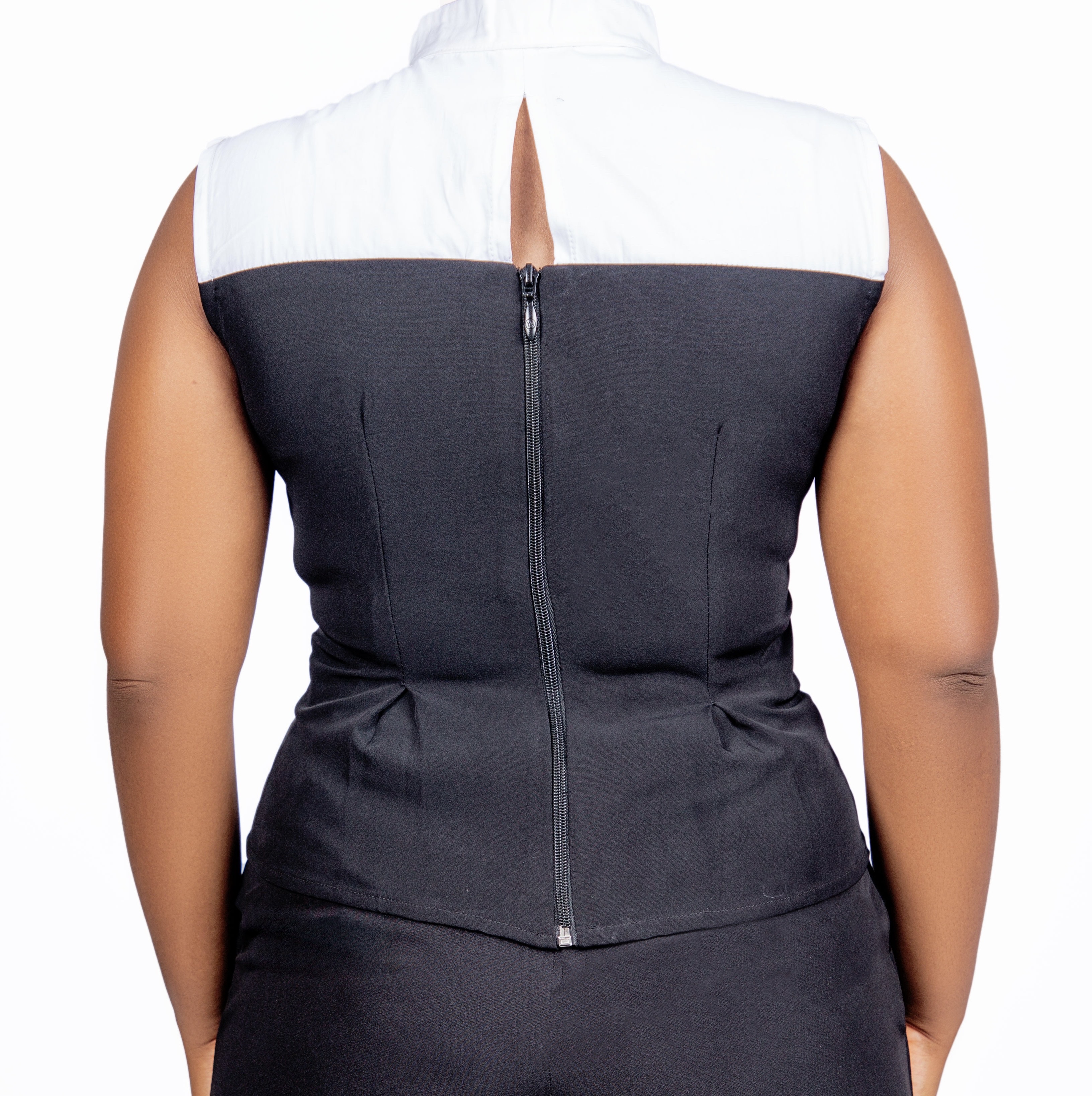 A unique cross breed top, featuring a sleeveless shirt with a V-neckline and a bishop collar. On the bottom, a monostrap with an asymmetric flap. Designed with an open back zip and a released waist dart.