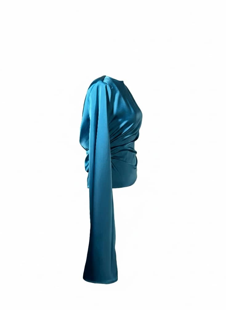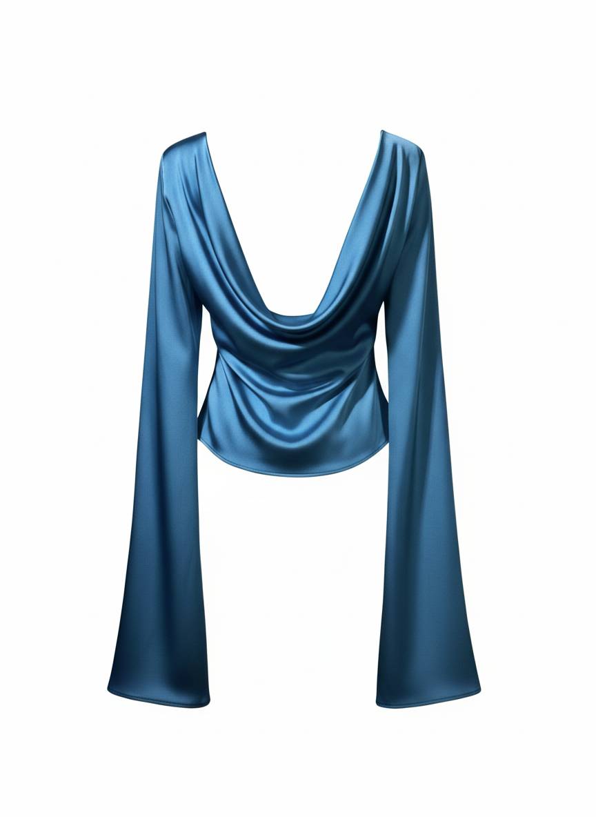 A two-way top featuring a high boatneck front. Deep cowl back detail, flared long bell sleeves, and a one side gathered waist. Includes a inner waist tie rope.